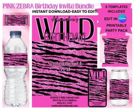 Girls Birthday Party Zebra Theme In Pink And Black Safari Party Theme Glam Zebra Party Instant Download Edit With Adobe Reader