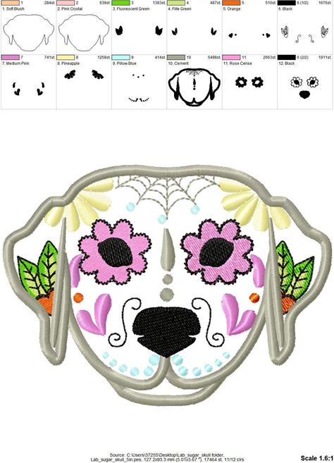 Lab Labrador Sugar Skull Applique Machine Embroidery Design, Pet Dog Skull Machine Embroidery For Hoop 3, 4, 5 And 6 Inches