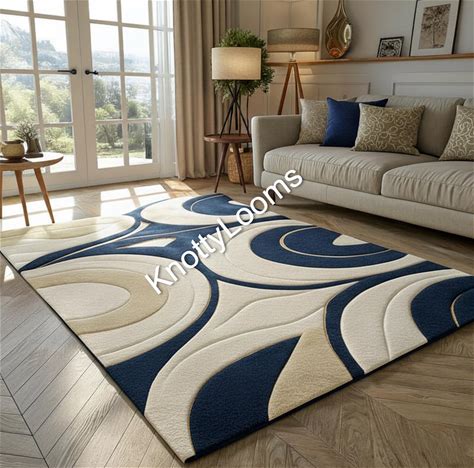 Modern Abstract Blue And Beige Rug | Luxury Hand Tufted Geometric Carpet For Living Room | Contemporary 3D Area Rug Home Décor