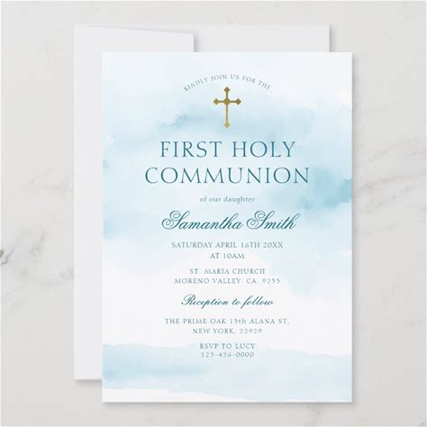 Dusty Blue Gold Cross First Holy Communion Invitation