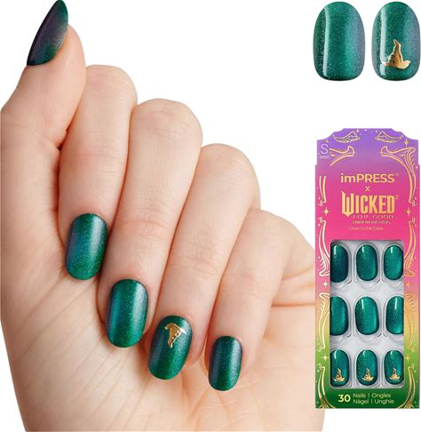 Impress X WICKED: FOR GOOD Press On Nails, A Story Of Two Halves, Green, Short Oval, New Improved Adhesive, Up To 10 Day Hold, Includes 30 Fake