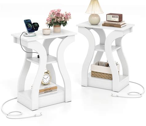 Gymax End Tables W/Charging Station Set Of 2 3-Tier Side Tables W/USB - White
