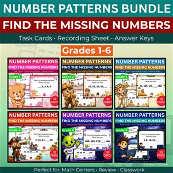Missing Patterns Numbers Task Cards Mega Bundle Number Sequences Grades 1-6 Math
