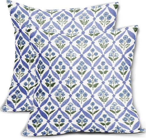Smozenith Blue Green Floral Block Print Pillow Covers 20X20 Set Of 2, Flower Pattern Spring Summer Print Decorative Throw Pillow Covers Outdoor