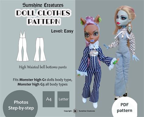 Sewing Pattern For Doll Flared Pants With High Waisted Bell-Bottoms Or Jumpsuit - Monster High G1, Monster High G3 Doll Clothes Pattern